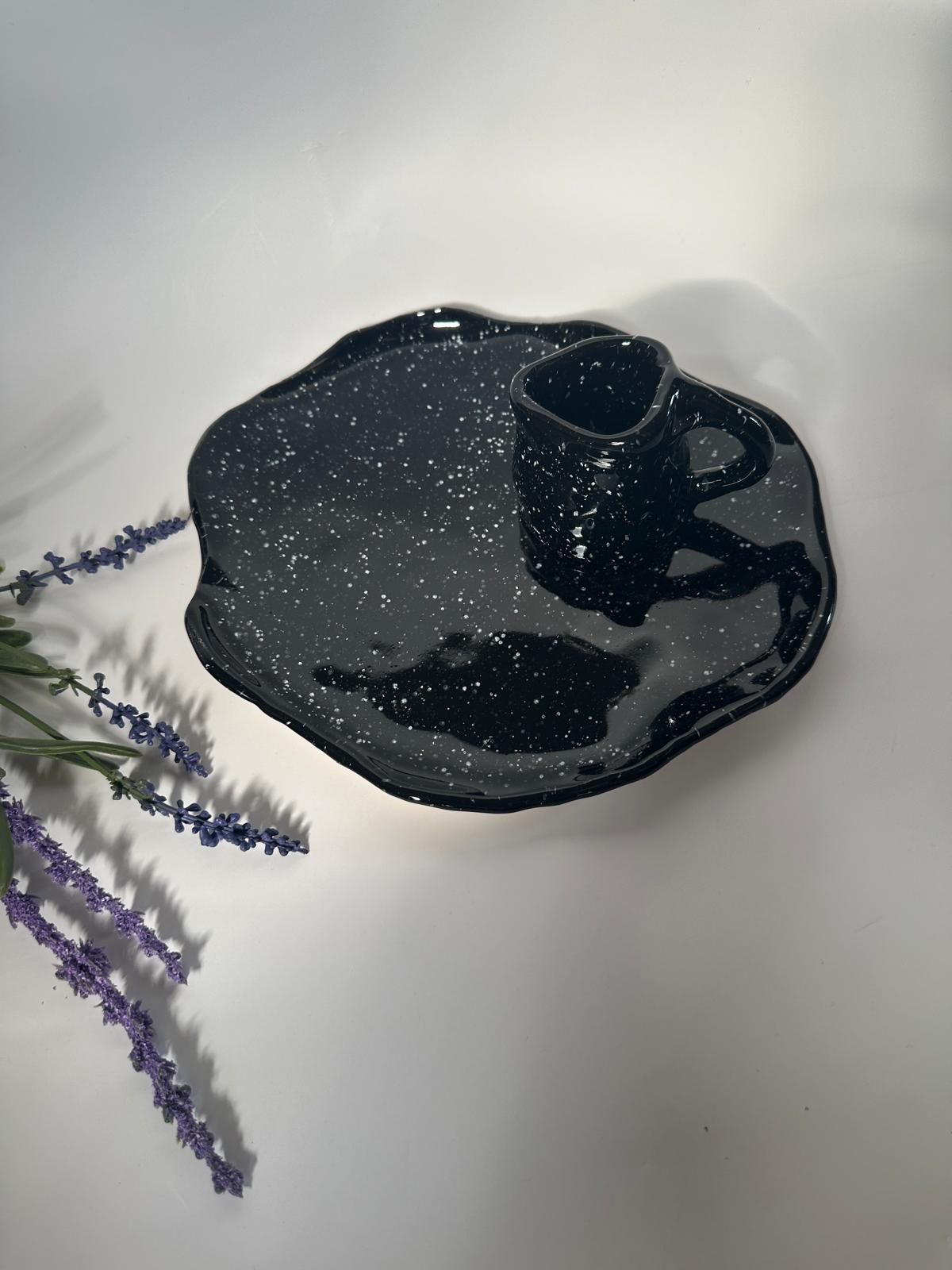 Teller mit Krug, handgemacht, glasiert in schwarz mit weißen Sprenkeln.