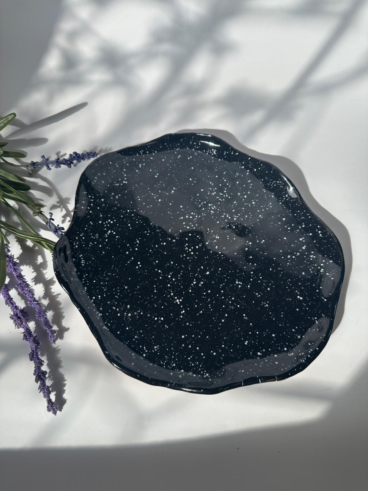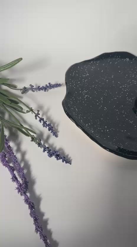 Die glänzende, tiefschwarze Glasur mit weißen Sprenkeln erinnert an einen Sternenhimmel und macht jedes Stück zu einem kleinen Kunstwerk.