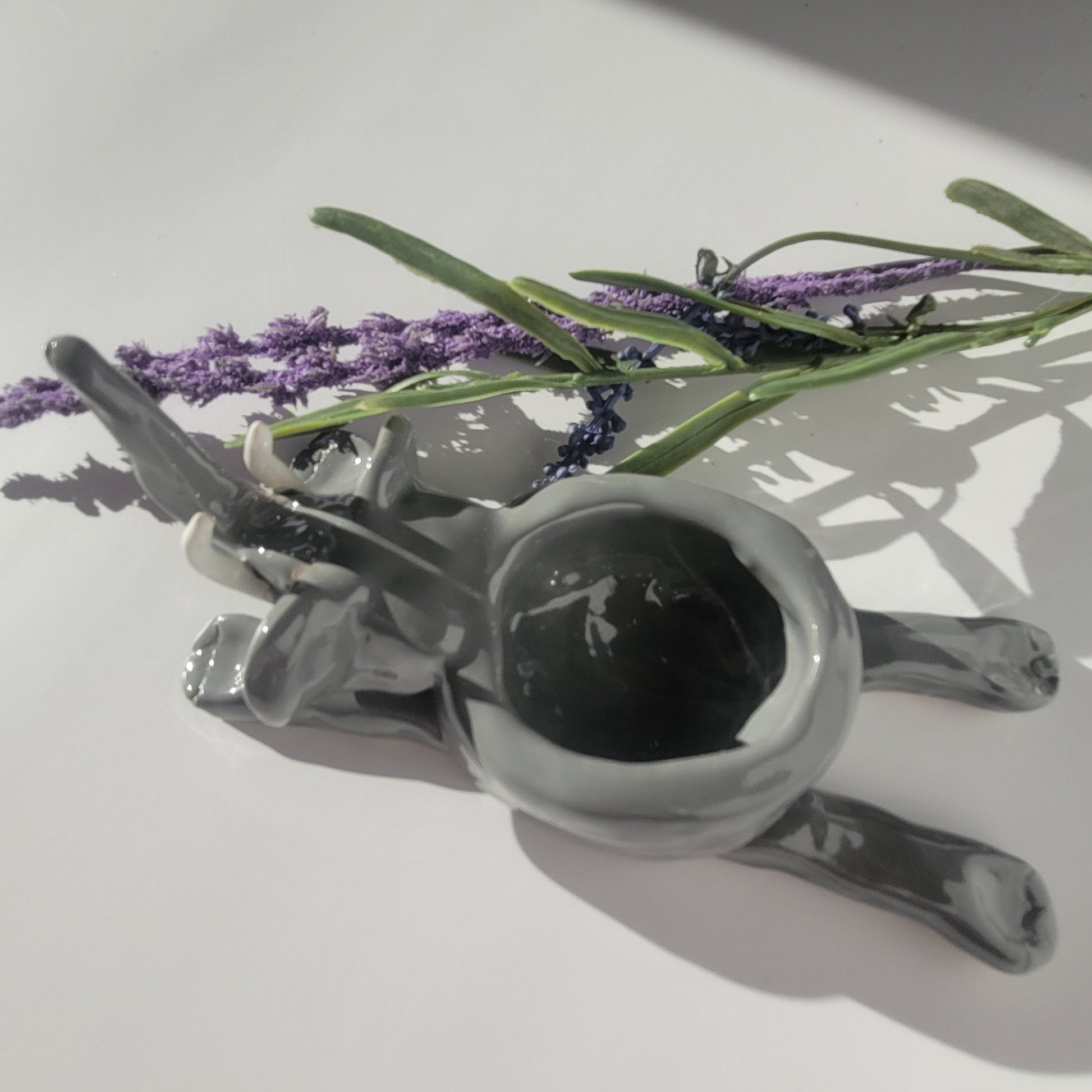 Dieser liebevoll handgefertigte Kerzenhalter in Form eines Elefanten bringt Wärme und Charme in dein Zuhause. Aus Keramik gefertigt und in elegantem Grau glasiert, hält der kleine Elefant ein Teelicht sicher in seinem Rücken. Die weißen Stoßzähne und die Augenpartie verleihen ihm einen besonderen Charakter.