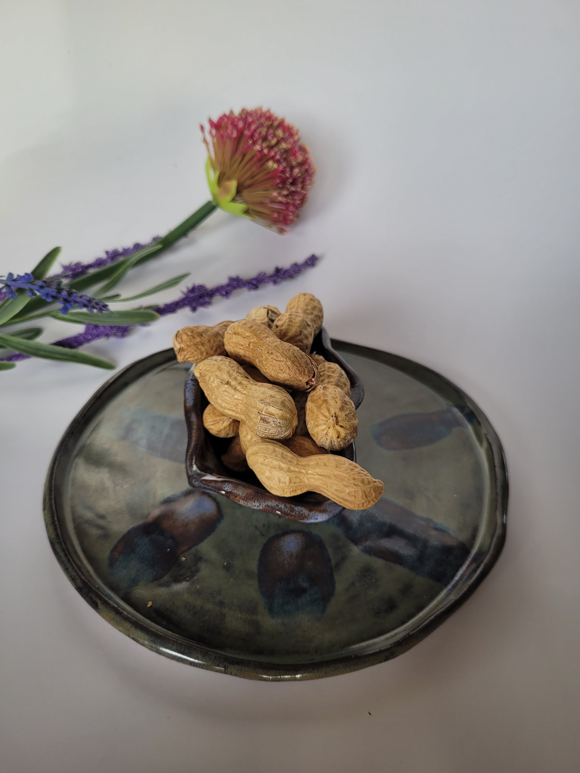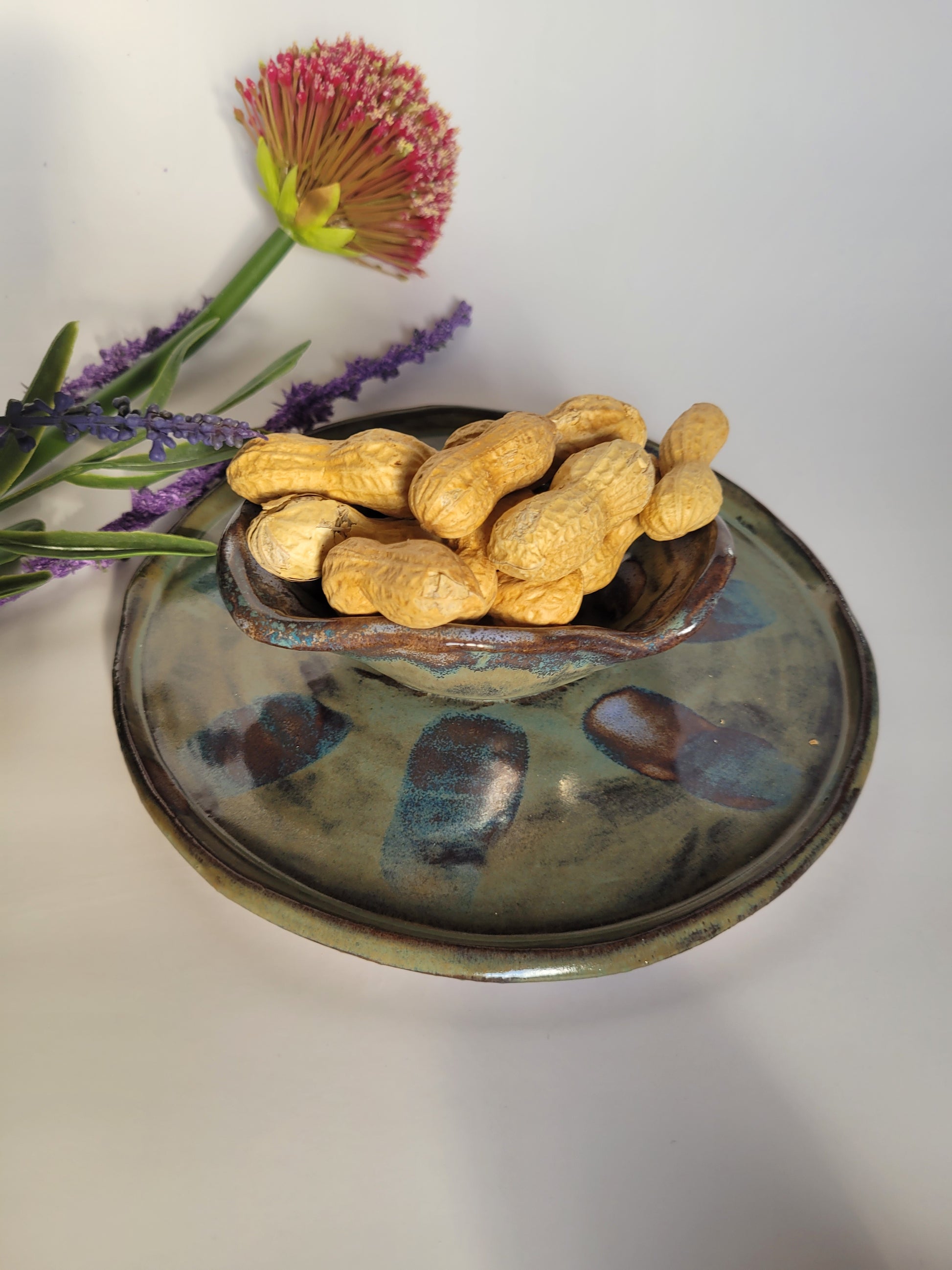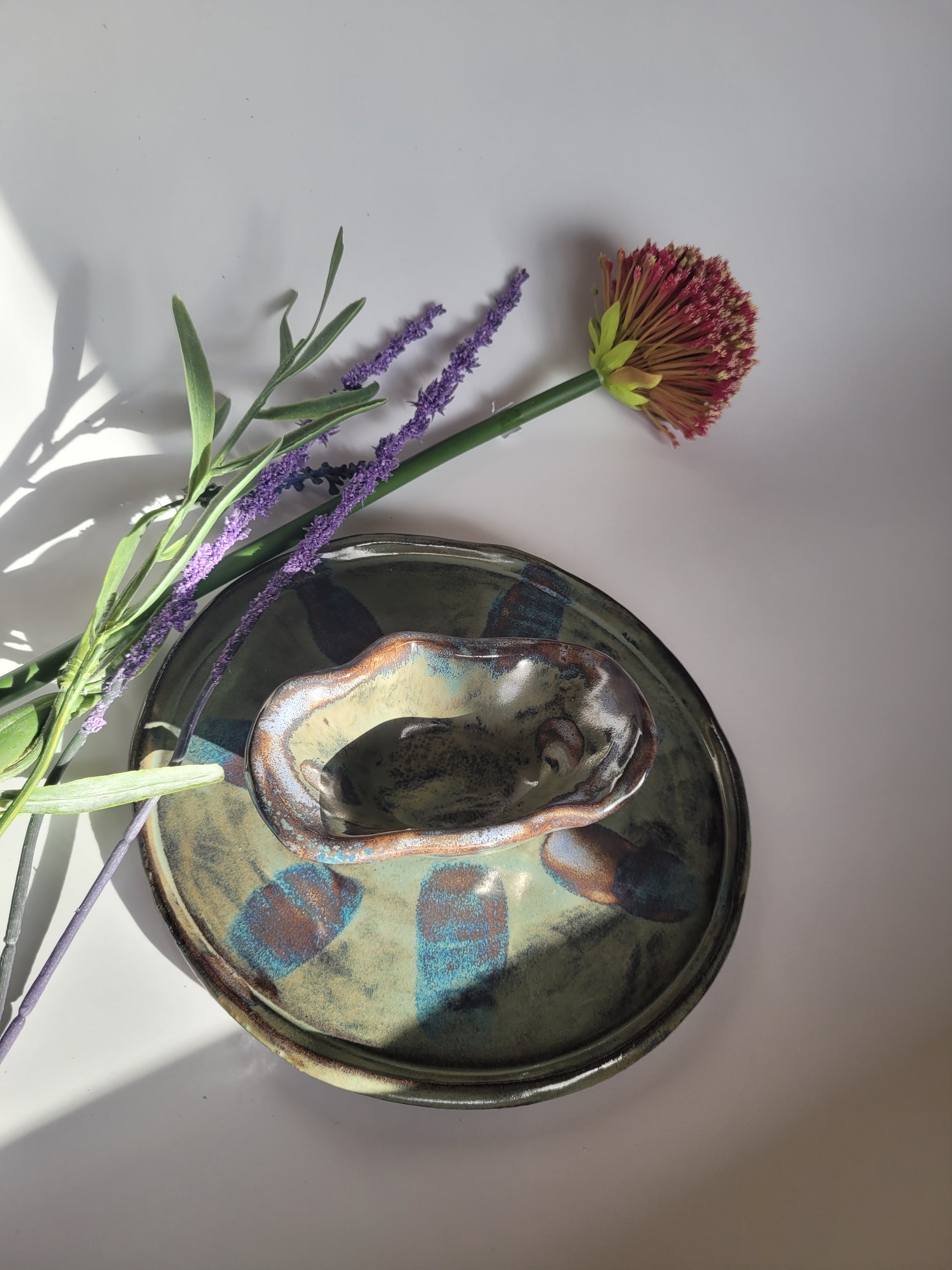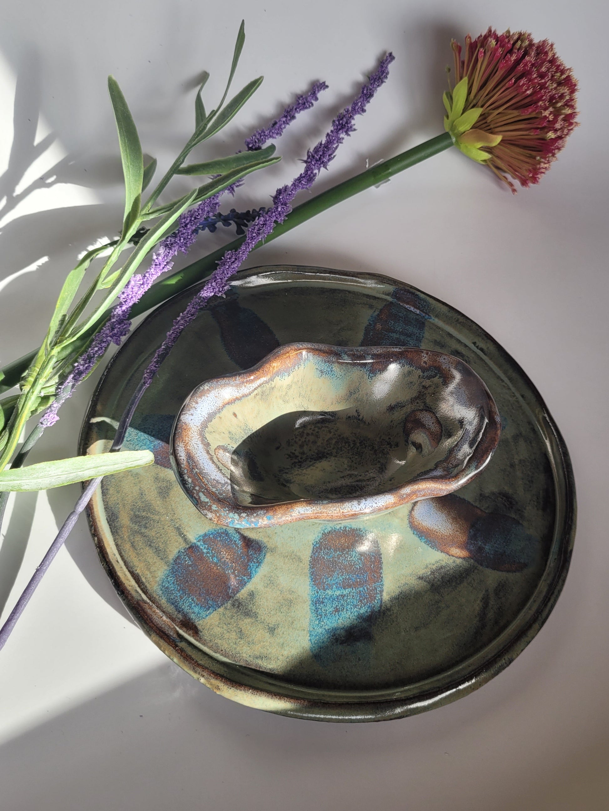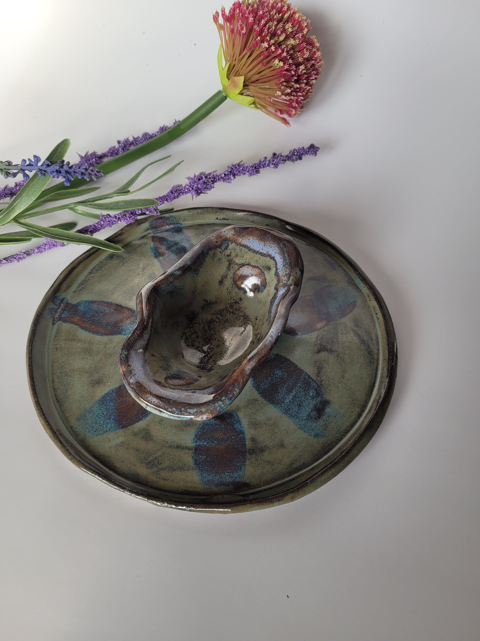 Dieser handgefertigte Teller mit Dipschale vereint rustikalen Charme mit künstlerischer Glasur.
