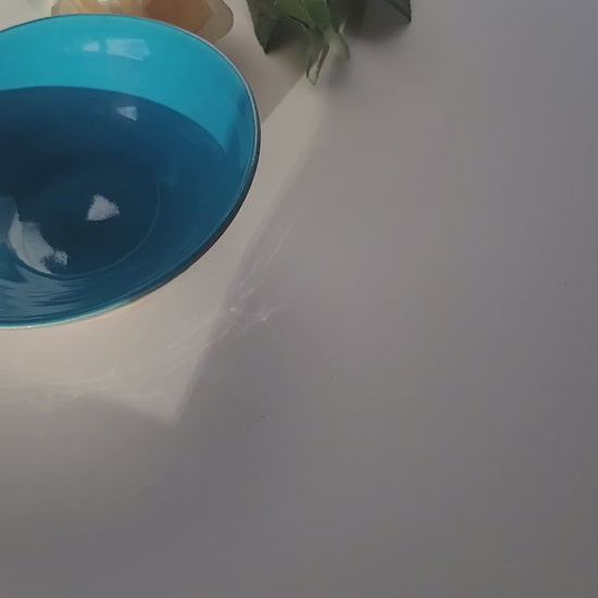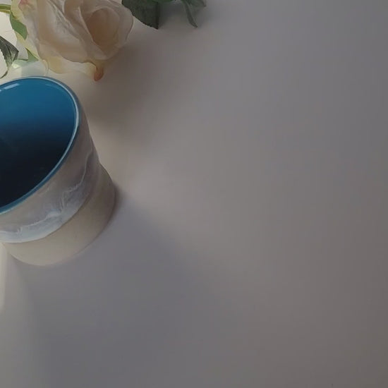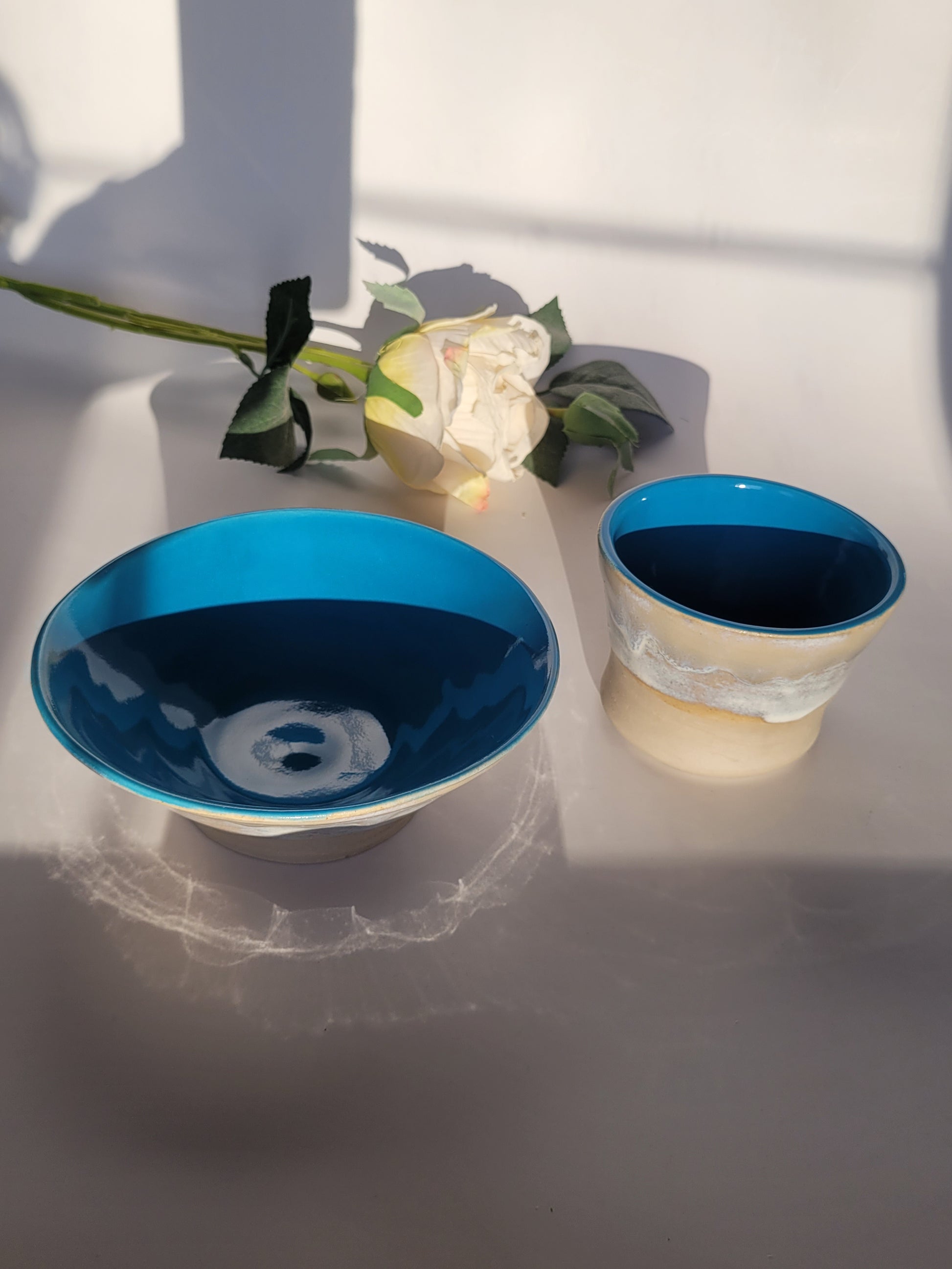 Keramik-Set in Ozeanblau, bestehend aus Becher und Müslischale, handgedreht und einzigartig